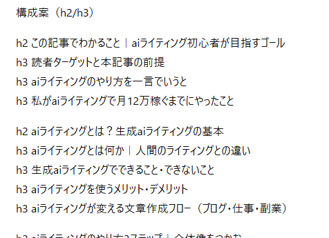 AIに「〇〇というキーワードで、初心者向けのブログ記事構成を作ってください」と指示し、H2(大見出し)やH3(小見出し)をリストアップさせます。