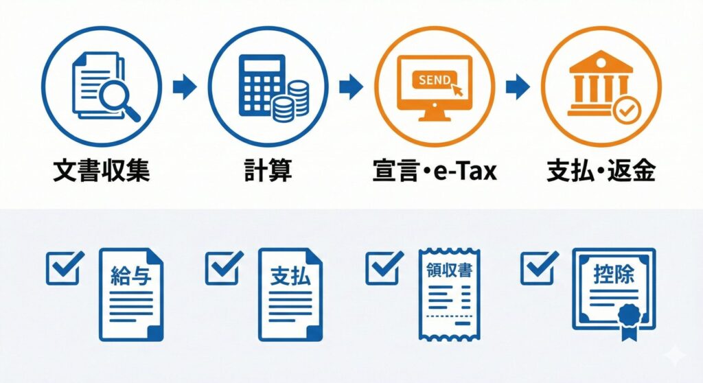 副業の確定申告は、「必要書類を集める→所得を計算する→申告書を作って提出する→納税か還付を待つ」という流れです。