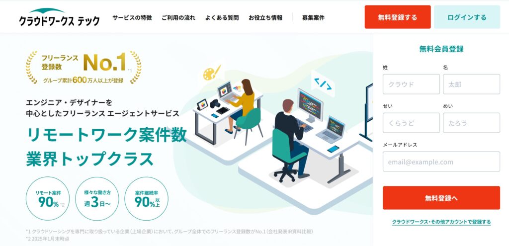 クラウドワークス テックは、ITエンジニア・Webデザイナーを中心としたフリーランスエージェント・求人紹介サービスです。