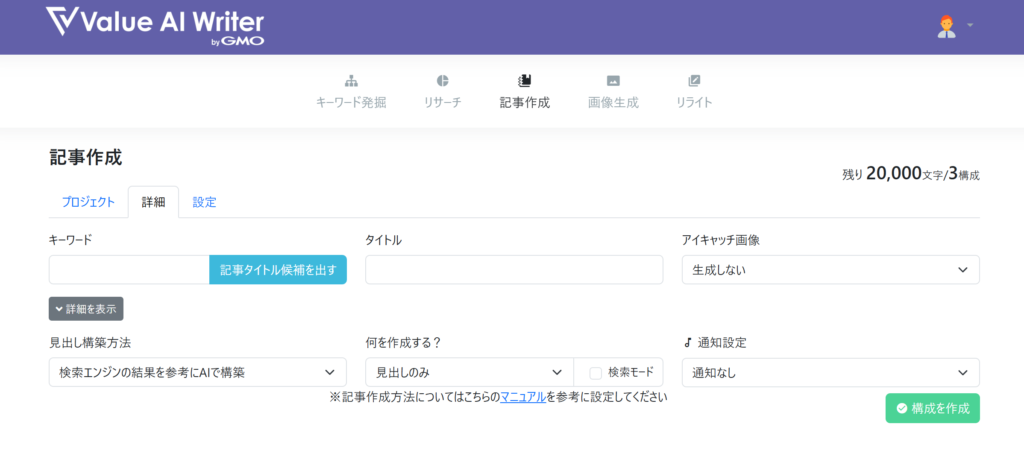 Value AI Writerは、狙いたいキーワードを入れるだけで、SEO的に評価されやすい見出し構成を提案してくれます。