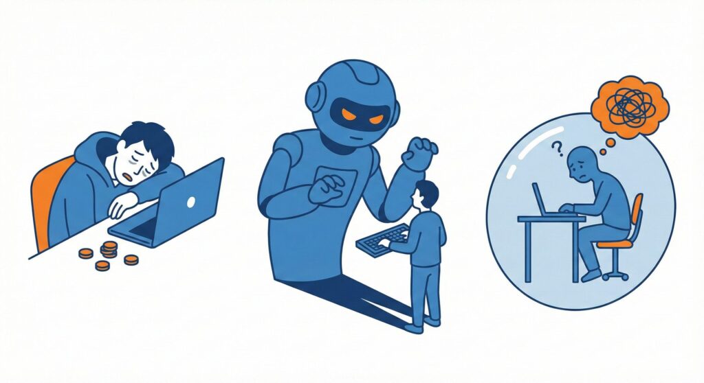 - 「やめとけ」の正体:文字単価0.5円以下の単純作業で消耗している人たちの言葉。ここには耳を貸さない。